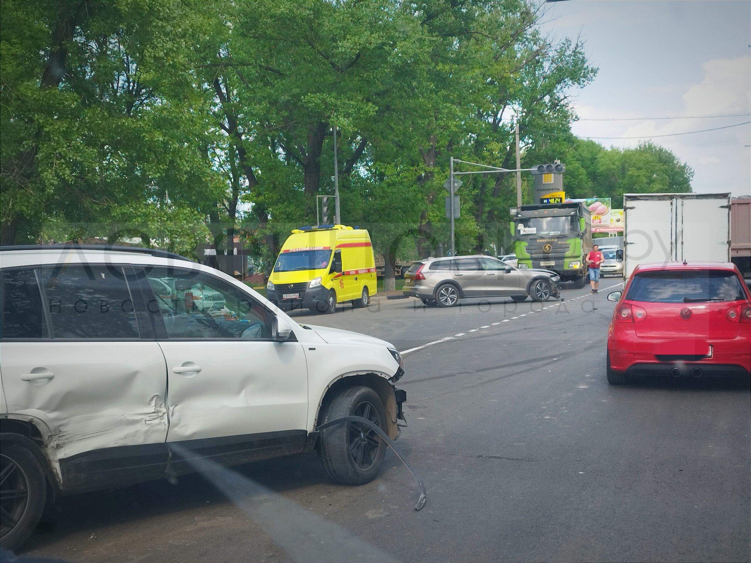 На изображении видно, что бригада медиков ведут для оказания необходимой помощи женщину. Вероятно, она была пассажиром Фольксвагена. По нашим данным, серьёзных травм никто не получил.