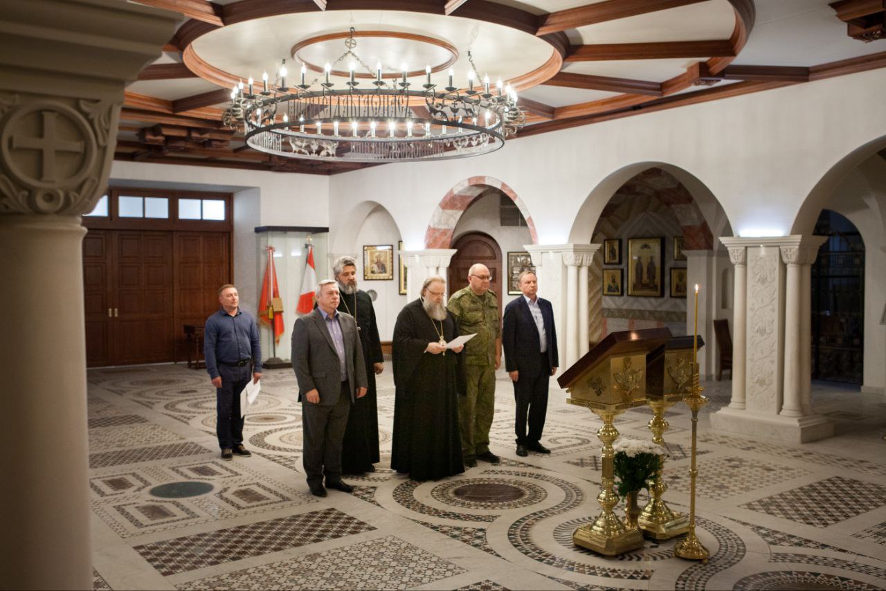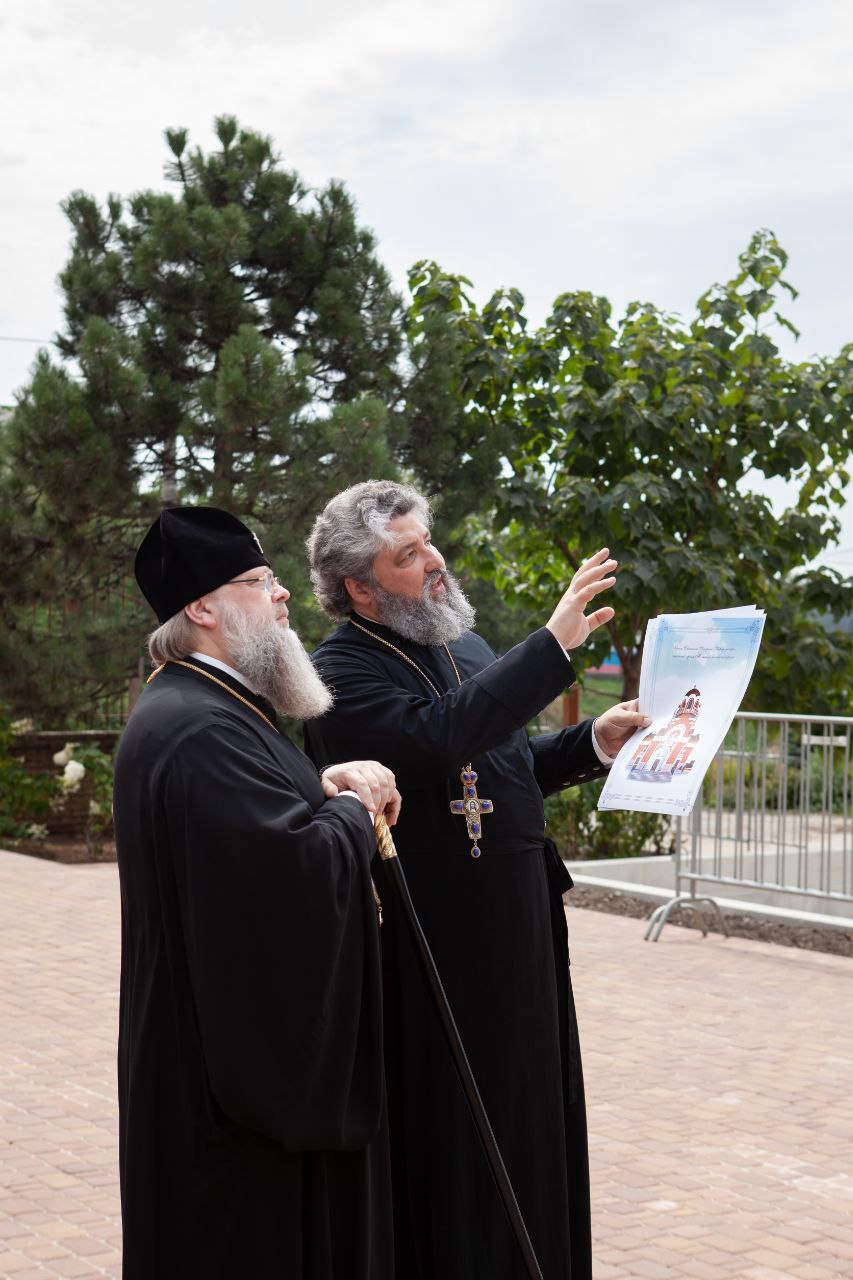 Высоких гостей встретил настоятель прихода Георгия Победоносца протоиерей Валерий Волощук. Он показал, как с момента прошлых их визитов изменилась территория прихода и рассказал о ходе строительства главного храма войск ЮВО.