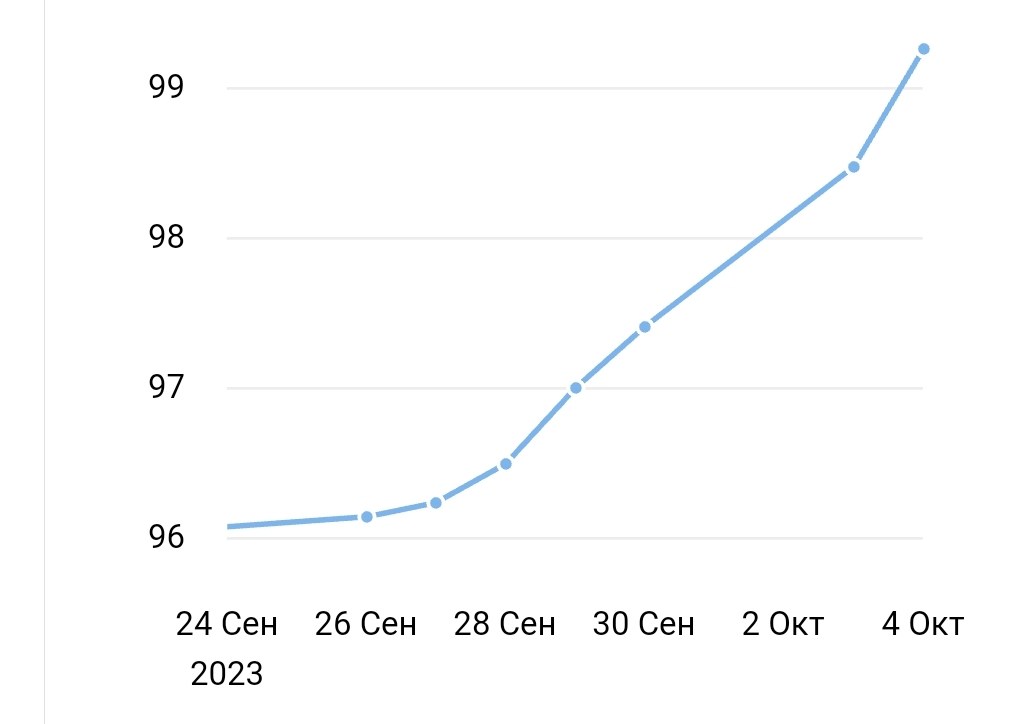 Например, 21.09.2023 американскую денежную единицу можно было приобрести за 96 рублей. 30 сентября доллар уже стоил 97 руб. Вчера, 3 октября, биржевые табло зафиксировали цену ещё на рубль дороже, и вот сегодня один бакс покупают за 99,26.