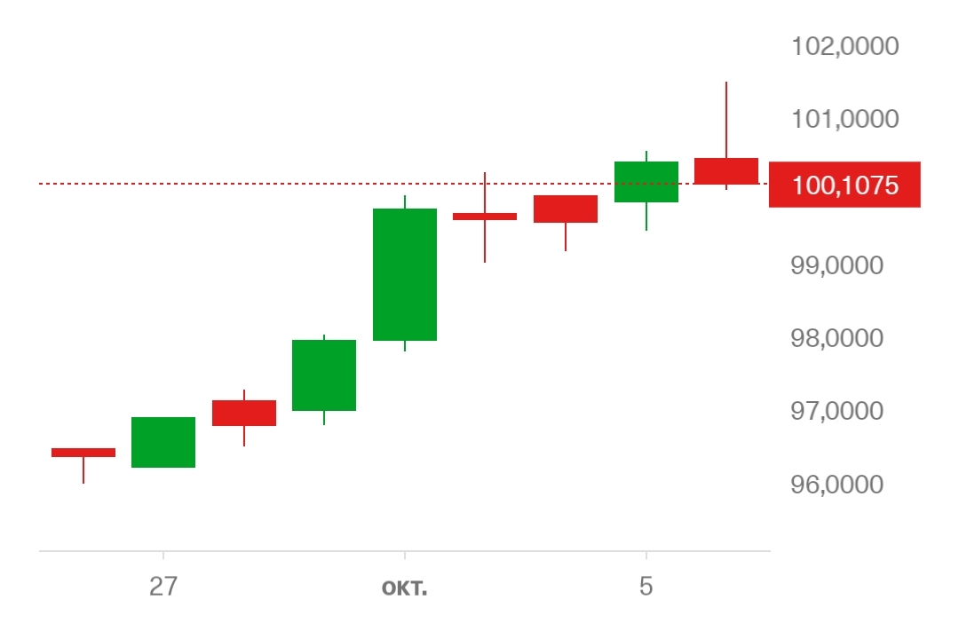 Американский доллар сегодня ещё сильнее укрепился. Валюту 6 октября покупают по 100 рублей. По графику “японских свечей” видно, что позиция торгуется в пределах сотни с трудом – шестого октября только красные значения.