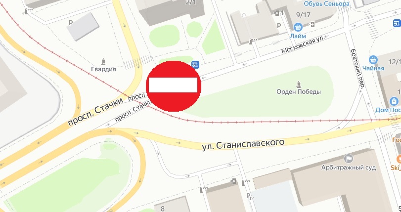 Многие ростовские водители обескуражены. А кто-то и вовсе пока не замечает (или игнорирует ?) знака “кирпич” и по привычке проезжает, куда уже ехать нельзя. Речь идёт о дороге по Стачки, по направлению с Западного в сторону Ц. Рынка по Московской улице. Это район площади 5-го Донского корпуса. Здесь неожиданно для автовладельцев поставили запрещающий знак.
